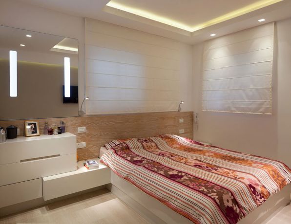 חדר שינה מעוצב בשילוב גמר עץ דקורציה ותאורה. עיצוב פנים יוסי שאול