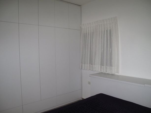 ארון קיר לבן בנוי בתוך נישה ללא ידיות בפתיחת טאצ' לפי הזמנה.