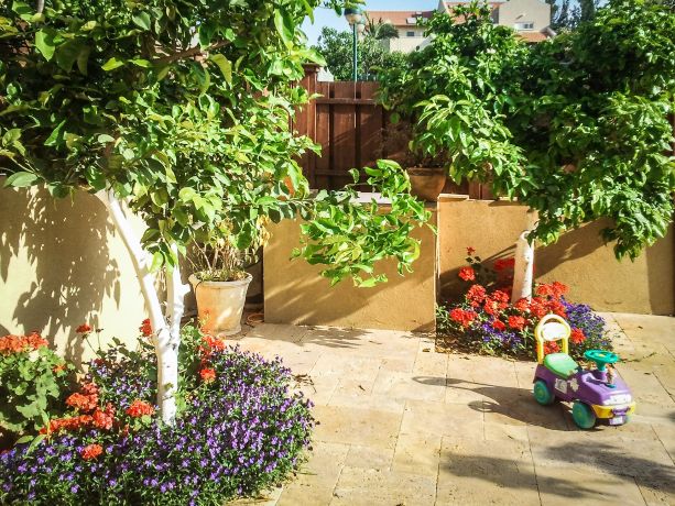 מרחב הגינה רוצף באבן טרבנטין צהובה משיש אריאל ושולבו בה ערוגות ועצי פרי להרגיש בתוך גן פורח ומצל.
