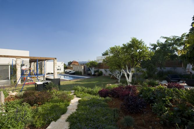 בתכנון הנוף התחשבו בתנאי השטח הקיימים ויצרו הפרשי גובה שנתנו מימד נוסף לגינה