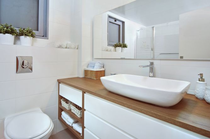 ארון עץ במבוק לחדר הרחצה.