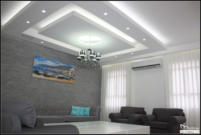 שימוש בגווני אפור עם שבירה של תכולים, עיצוב תקרת גבס עם תאורה נסתרת
