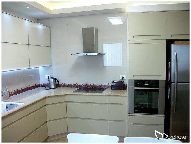 עיצוב מטבח עם חיפוי קיר זכוכית מעוטר פולי קפה