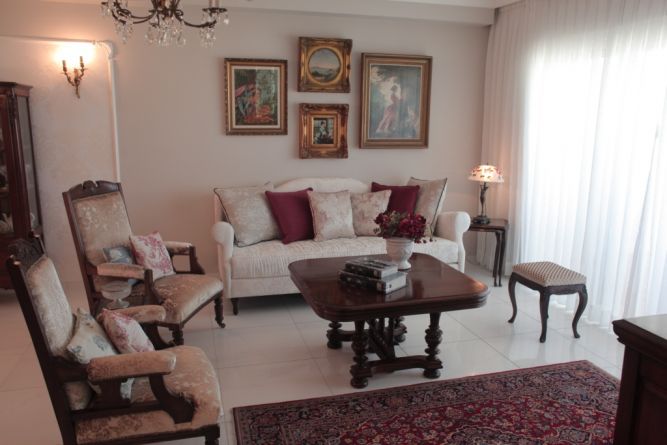אתגר היה לשלב את הריהוט הקלאסי אך עדיין לקבל מראה מאוורר ולא עמוס. התמונות מעל הספה עוצבו כמקבץ מה שמעצים יותר את הנוכחות שלהן.