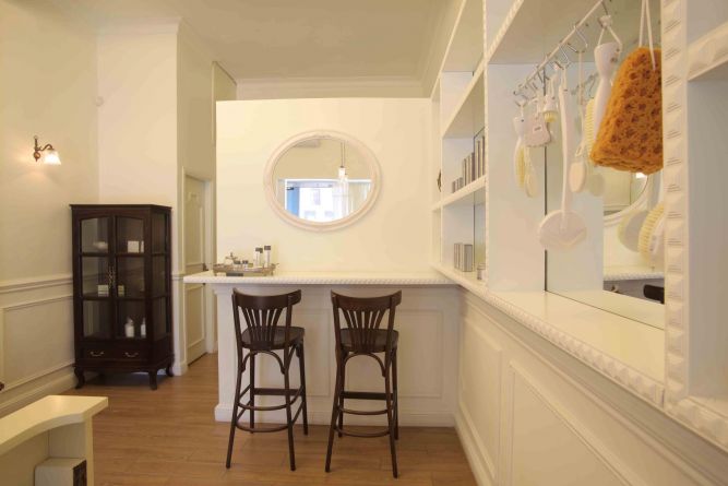 דלפק איפור חשוף ללקוחות נוצר להענקת חווית איפור במכון בסמוך לפינת ההמתנה בנוי מחומרי הגלם הזהים ליחידה התלויה הפתוחה ע"מ ליצור המשכיות וזרימה בחלל