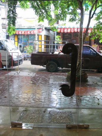את ידית הכניסה לחנות עיצבתי הדמות קישוטי הפגודות בעיר יצרתי שבלונה ומסרתי לחיתוך ברזל