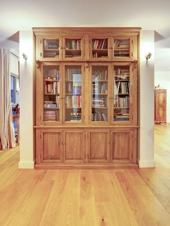 ארון ספרים גבוה וגדול, כך שיכול להכיל הרבה ספרים. לצידו מונח סולם לעזרה בהגעה למדפים גבוהים מאד.