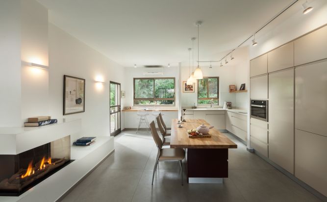 מטבח לבן מעוצב עם ידית שקועה למראה אלגנטי.