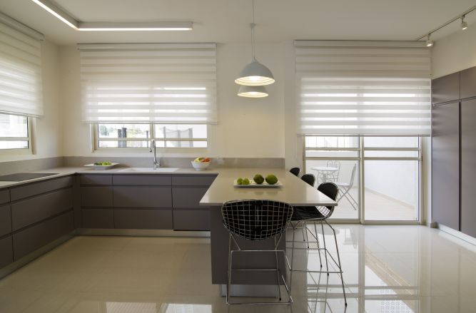 מטבח פורמייקה המדמה עור הפוך בצבע אפור בז'.