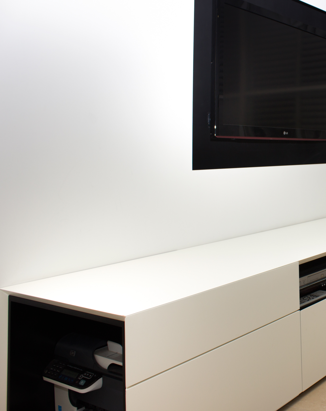 מיקום מדפסת וציוד משרדי בצד יחידת המזנון לטובת פינת העבודה במחשב. לא ניתן לראות את המדפסת מהסלון כמעט