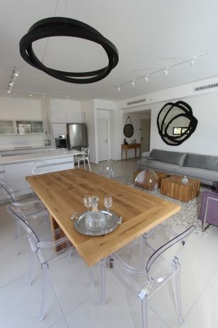 שולחן מעוצב עשוי עץ שיטה מצופה בשעווה ורגלים מפלדה במראה עתיק.