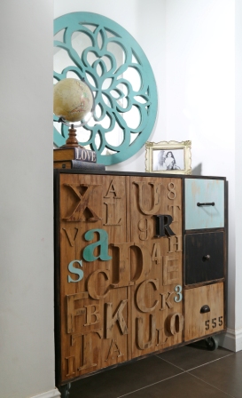 שידה שתוכננה במחיוחד, במראה של ארגז בלוי, בגוונים של שחור-תכלת-טורקיז שיתאימו לשאר הבית. מראה אקלקטי - אורבני