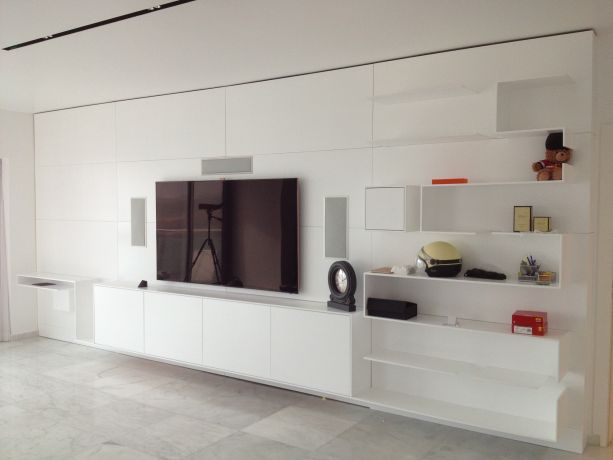 חיפוי קיר סלון בשילוב מדפים מדוקקים ומזנון בגמר צבע לבן מט.