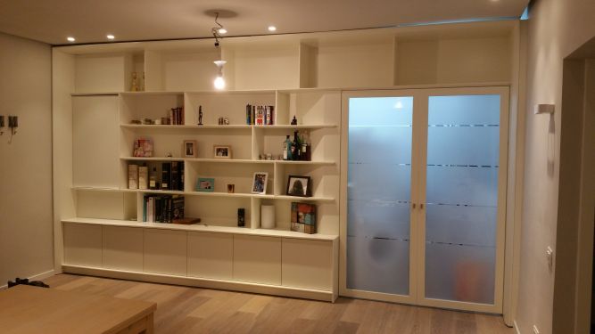 ספריית קיר לסלון בגמר צבע מט משי, בשילוב דלתות למעבר לחדר שירות.