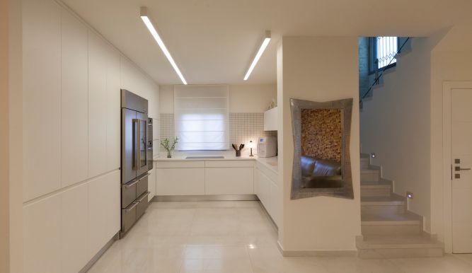 מטבח לבן מזכוכית, בעל ידית אינטגרלית, מעוצב בקו נקי ומודרני, המשלב בתוכו יוקרתיות וחדשנות, מבלי להתפשר על יכולת אחסון מירבית.