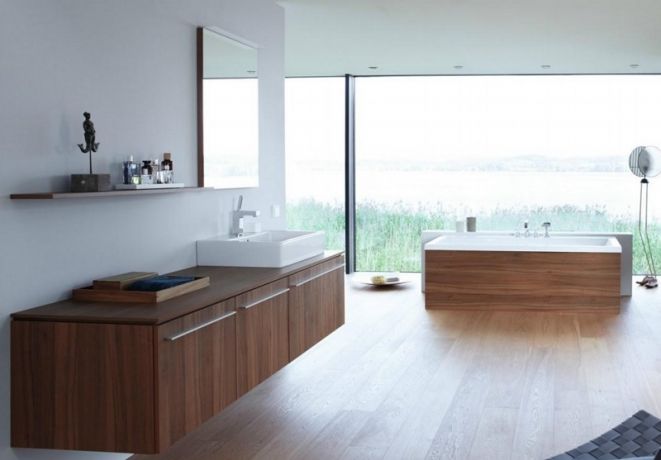 חדר אמבטיה מרווח בסגנון כפרי המשלב ארונות וחזיתות מעץ.
