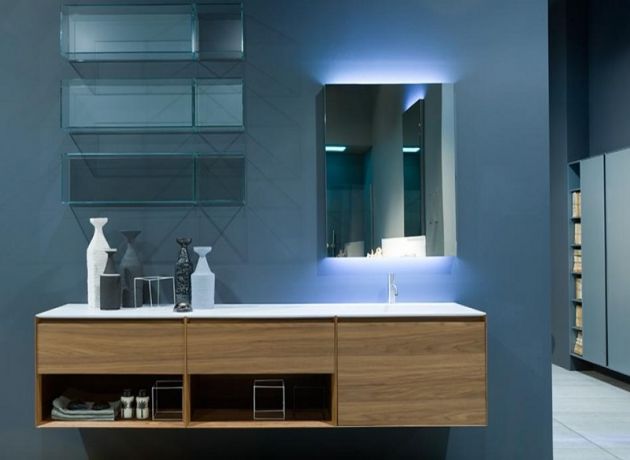 חדר אמבטיה בסגנון מודרני המשלב בתוכו ארון אמבטיה תחתון עם חזיתות מעץ.
