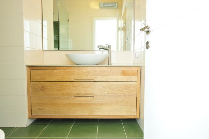 ארון מקלחת עץ אלון עם ידיות מכורסמות.