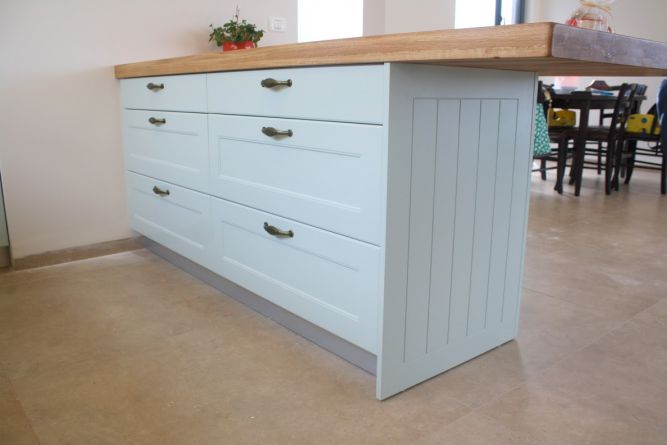 מטבח כפרי בשילוב עץ אלון וצבע תכלת.
