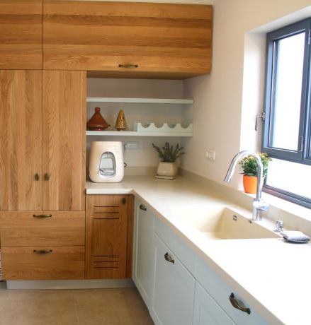 מטבח כפרי בשילוב עץ אלון וצבע תכלת