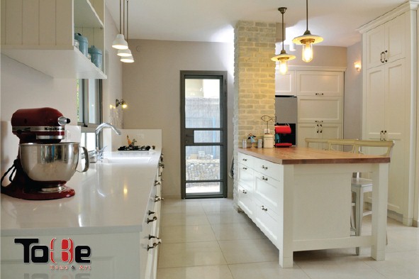 מטבח פרובנס בצבע שלייף לק עם אי לאיחסון ואכילה ומשטח עליון עץ מלא אלון מולבן.