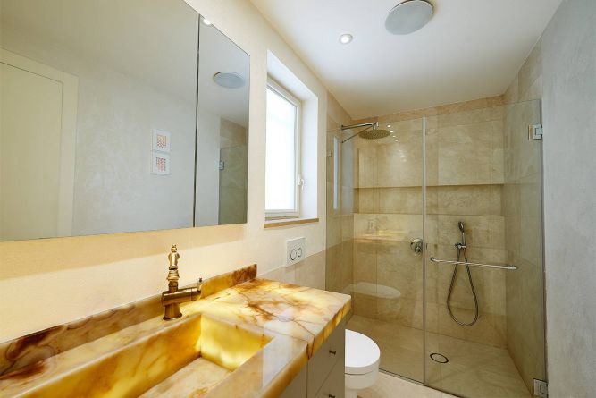 דירה בשוכנת רחביה, ירושלים- בחלל הפרטי תוכננה סוויטת הורים מפנקת עם חדר רחצה מואר ומאוורר, משטח אוניקס לבן הונח עבור ארון כיור ובלילה אפשר להדליק את נורות ה- -LED מתחתיו ולקבל אווירה רומנטית וקסומה גם בחדר הרחצה.