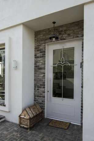 דלת כניסה מפרופיל בלגי, בשילוב חיפוי בריקים ע"ג הקיר