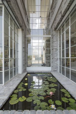 בריכת דגים מול הכניסה לבית, נשקפת דרך חלונות היקפיים לכל החללים הציבוריים בבית