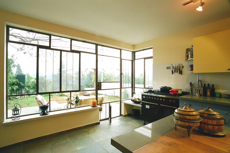 מטבח מודרני מואר עם קיר זכוכית- אורלי ערן, אדריכלות ועיצוב פנים