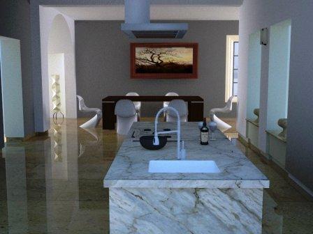 מטבח בעיצוב נקי עם מבט לפינת אוכל