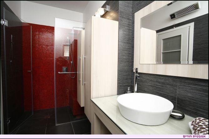 עיצוב חלל אמבטיה , מעוצב בצבעים שחור, לבן, אדום, חדר רחצה הורים