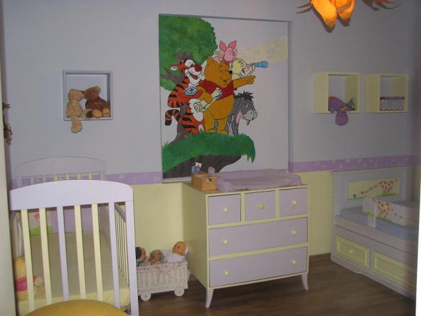 חדר ילדים, מעוצב בסגנון צעיר בגווני סגול, ציור קיר, רצפת פרקט.