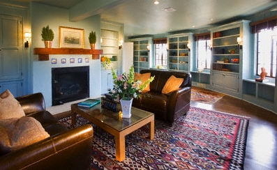 סלון מעוגל, אח במרכז הסלון, שטיחים אתניים, מראה עתיק .
