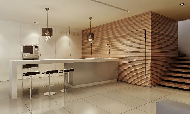 מטבח מודרני, מינימליסטי, שילוב לייסטים עץ,ארונות גבוהים בגוון בהיר.