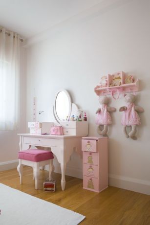 חדר ילדה מעוצב בורוד ולבן, שולחן איפור מוקפד.